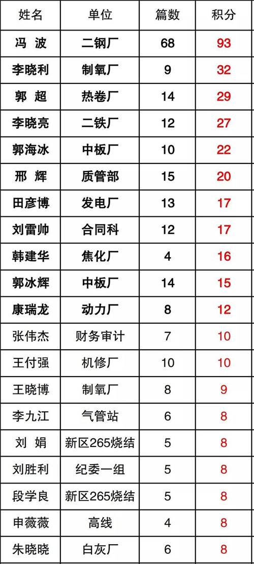 出,普陽煉鋼廠、制氧廠、熱卷廠、中普煉鐵廠、中板廠、質(zhì)管部、發(fā)電廠、合同科、焦化廠、動(dòng)力廠等單位在企業(yè)文宣方面重視力度較高,特別是普陽煉鋼廠,通過有力的組織激勵(lì)措施,發(fā)動(dòng)廣大工友積極投稿,通過集體的力量,高居積分榜首,值得各廠借鑒。
