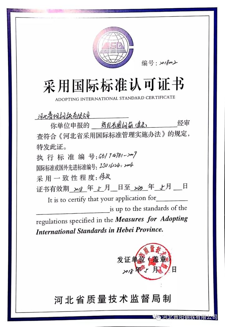 近日,經(jīng)過國家標(biāo)準(zhǔn)化管理委員會(huì)、河北省質(zhì)量技術(shù)監(jiān)督局的嚴(yán)格檢驗(yàn)以及行業(yè)專家對(duì)產(chǎn)品實(shí)物質(zhì)量與國外同類產(chǎn)品質(zhì)量性能指標(biāo)的比較評(píng)估,核定我公司生產(chǎn)的熱軋光圓鋼筋(盤條)指標(biāo)完全符合國際標(biāo)準(zhǔn)要求,質(zhì)量達(dá)到國際先進(jìn)水平,國家標(biāo)準(zhǔn)化管理委員會(huì)、河北省質(zhì)量技術(shù)監(jiān)督局特授予《采用國際標(biāo)準(zhǔn)產(chǎn)品標(biāo)志證書》和《采用國際標(biāo)準(zhǔn)認(rèn)可證書》。這標(biāo)志著我公司的熱軋光圓鋼筋(盤條)順利通過“雙采”認(rèn)證。