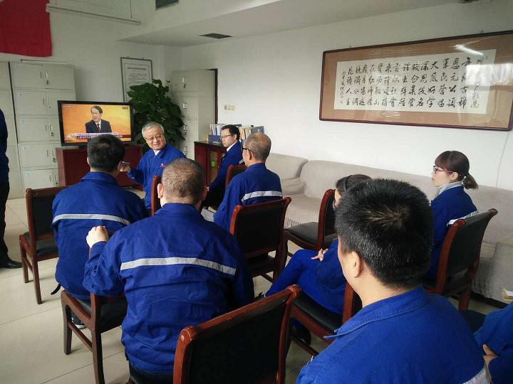 公司黨委書記郭恩元和公司黨員代表正在觀看“中國共產(chǎn)黨第十九次代表大會開幕式。