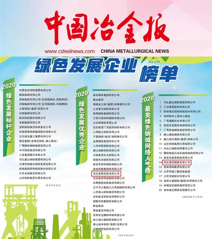 世界環(huán)境日,中國(guó)冶金報(bào)社發(fā)布綠色發(fā)展企業(yè)榜單。河北普陽(yáng)鋼鐵有限公司憑借卓越的環(huán)保治理社會(huì)貢獻(xiàn)力和公眾認(rèn)可度,從參評(píng)的140家國(guó)內(nèi)知名鋼企中脫穎而出,榮獲“2020年度綠色發(fā)展優(yōu)秀企業(yè)”榮譽(yù)稱號(hào),入列“最美綠色鋼城網(wǎng)絡(luò)人氣榜”,這是普陽(yáng)鋼鐵集團(tuán)去年以來(lái)連續(xù)兩次獲評(píng)“綠色發(fā)展優(yōu)秀企業(yè)”。