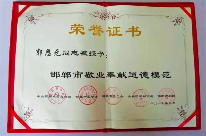近日,由邯鄲市委宣傳部、市文明辦、市總工會(huì)、團(tuán)市委、市婦聯(lián)聯(lián)合舉辦的“邯鄲市第七屆道德模范頒獎(jiǎng)典禮暨2019年度新時(shí)代好少年先進(jìn)事跡發(fā)布會(huì)”,在市廣播電視臺(tái)演播大廳舉行。會(huì)議表彰了對(duì)推進(jìn)全市精神文明建設(shè)做出突出貢獻(xiàn)的企事業(yè)單位和個(gè)人,全國(guó)十大杰出企業(yè)家、全國(guó)鋼鐵工業(yè)勞動(dòng)模范、普陽(yáng)鋼鐵集團(tuán)黨委書記、董事長(zhǎng)郭恩元榮獲“邯鄲市敬業(yè)奉獻(xiàn)道德模范”榮譽(yù)稱號(hào)。