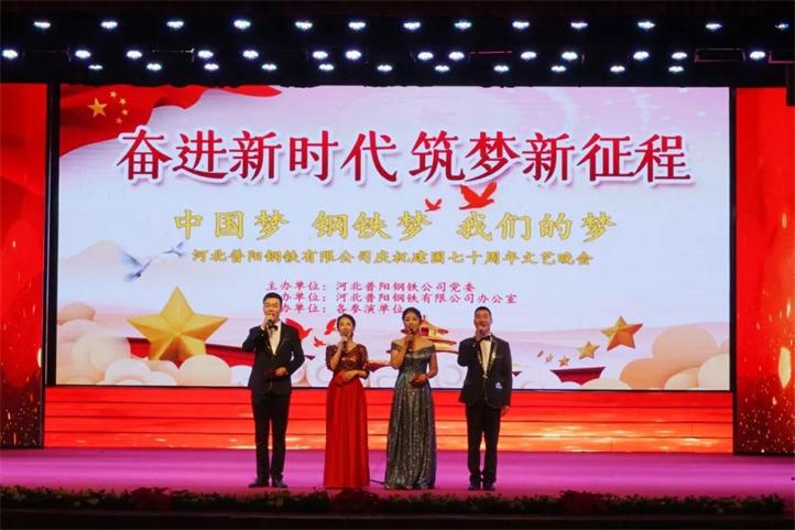 為熱烈慶祝建國(guó)70周年,河北普陽(yáng)鋼鐵集團(tuán)在文化中心千人禮堂舉辦“不忘初心牢記使命·中國(guó)夢(mèng)鋼鐵夢(mèng)我們的夢(mèng)”主題晚會(huì)。陽(yáng)邑鎮(zhèn)副書(shū)記楊貴寶、人大主席李國(guó)強(qiáng),集團(tuán)黨委書(shū)記、董事長(zhǎng)郭恩元,副書(shū)記、總經(jīng)理石躍強(qiáng),經(jīng)理會(huì)成員出席了晚會(huì),各廠廠長(zhǎng)、部室負(fù)責(zé)人及員工共計(jì)1000余人觀看了晚會(huì)。