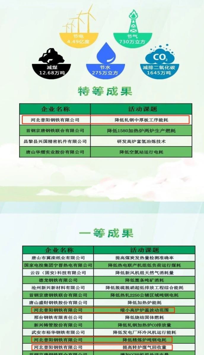 ? ? ? 本次征集活動,堅持全員參與、注重實效、促進交流的原則,采用自主申報、推薦等方式,共征集業(yè)績成果169項,主要涉及節(jié)能、節(jié)水、二氧化碳和重點污染物減排等方面,經(jīng)行業(yè)專家評審,評出特等成果4項,一等成果30項,二等成果45項。其中,河北普陽鋼鐵有限公司(以下簡稱“普陽”)提交的降低軋鋼中厚板工序能耗課題獲評特等成果,縮小高爐爐溫波動范圍、降低精煉爐噸鋼電耗以及提高轉(zhuǎn)爐煤氣回收量3項課題被評為一等成果。據(jù)不完全統(tǒng)計,本次評定的成果應(yīng)用經(jīng)濟效益可達3.63億元/年。年節(jié)電4.49億kWh、節(jié)氣730萬m3、減煤12.68萬t、壓采地下水275萬m3、減排CO21645萬噸,大幅削減重點污染物排放。