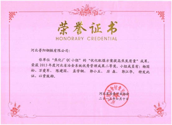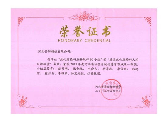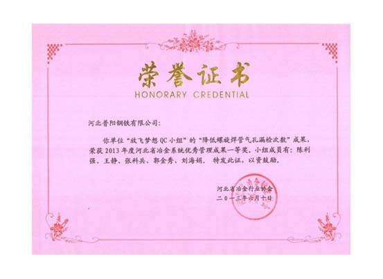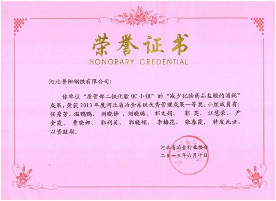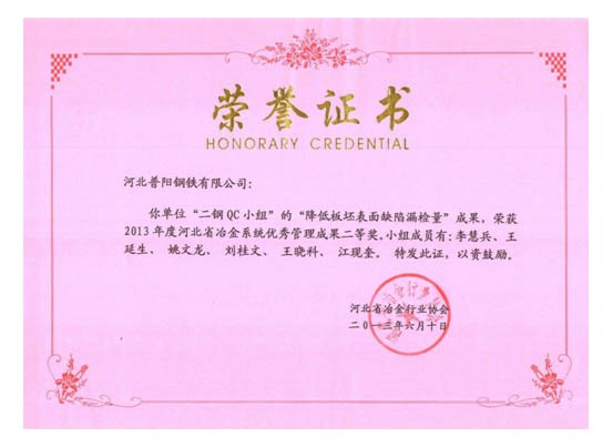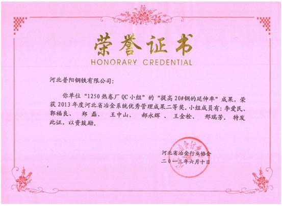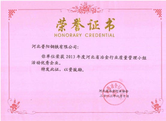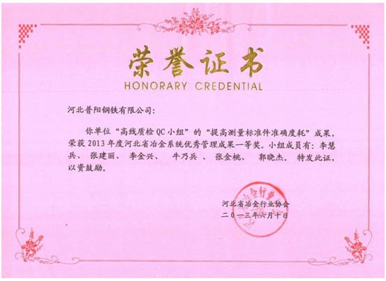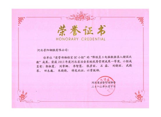 QC小組課題獲得了一等獎8個,二等獎3個的好成績,同時公司榮獲“2013年度河北省冶金行業(yè)質(zhì)量管理小組活動優(yōu)秀企業(yè)”的稱號。